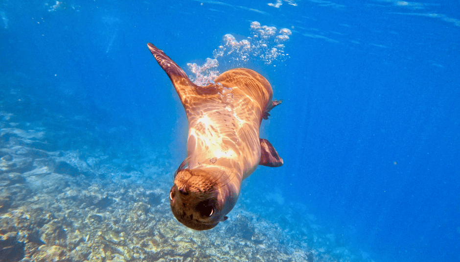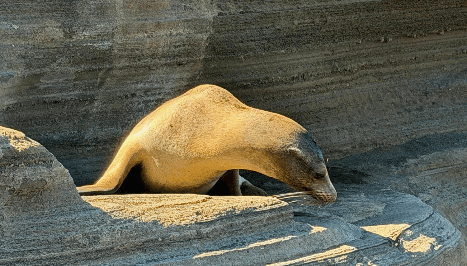 Day three on the ship, took us to the striking red-sand beaches of Rábida Island. This island is a haven for sea lions, Darwin’s finches, and Galápagos hawks. We started with a 6:30 AM sunrise hike, followed by a snorkel that felt like swimming in an aquarium. This was an epic snorkel for our group as the waters had high visibility and there were encounters with sea lions, green turtles, a huge Galapagos shark, rays, and massive schools of fish. Many of us could have spent three more hours in the water!