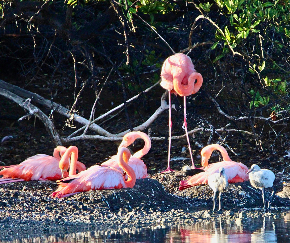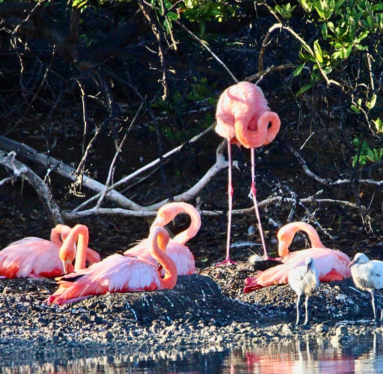 Our first landing was Las Bachas beach on Santa Cruz Island. This stunning white-sand beach is a major nesting site for green sea turtles. Within minutes, we were seeing the "greatest hits" of Galápagos wildlife: pink flamingos wading in brackish lagoons, blue-footed boobies, frigate birds, and those iconic bright-red Sally Lightfoot crabs scuttling over black volcanic rock. It was a spectacular introduction to the islands!